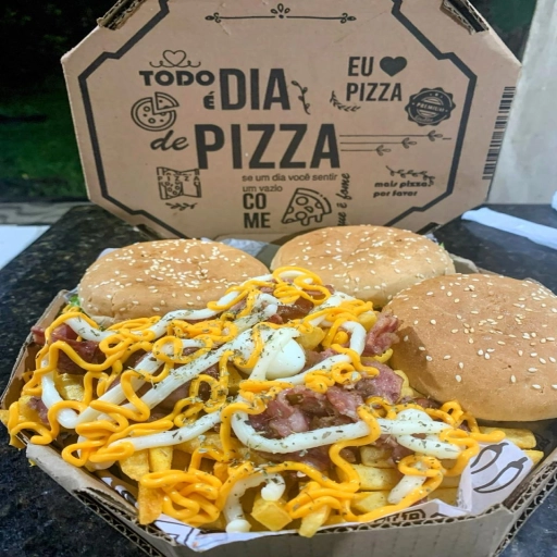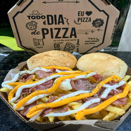 Frango Desfiado, 1 Ovo, Bacon, Calabresa, Queijo, Presunto, Catupiry, Molho Especial, Salada e Batata Palha.